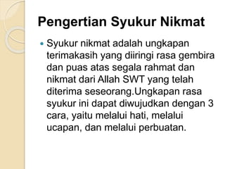 Apa Itu Pengertian Syukur Nikmat Serta Hikmahnya dan Sikap Syukur Nikmat. 152 dalam ayat ini allah taala memerintahkan kepada kita untuk bersyukur atas nikmat yang telah allah berikan dan melarang kita untuk berbuat kufur. Nikmat yang diberikan sangat banyak dan bentuknya bermacam2 disetiap detik yang dilalui maninusia tidak pernah lepas dari nikmat allah nikmatnya sanggat besar.